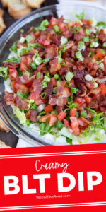Bake BLT Dip in the oven for 15 minutes. Add BLT Dip mixture to a small cast iron skillet. Dice the tomatoes shred the lettuce and cheese and cookcrumble the bacon.